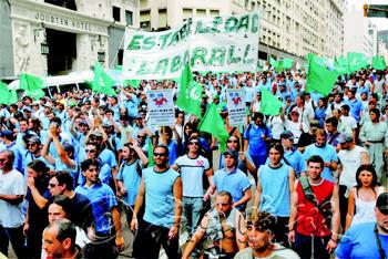 | 2008年11月10日,阿根廷的劳工组织成员在举行示威活动,要求政府采取措施,避免出现企业大规模倒闭和裁员。(资料片)