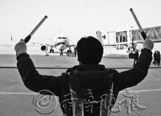 | ◤2013年12月31日,来自台湾的旅客正在经过威海国际机场的旅客通道。 见习记者 丛子茗 摄 |  | ▼12月31日,威海国际机场的工作人员正在指挥飞机进入等待区。 见习记者 丛子茗 摄 |