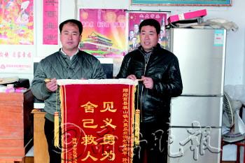 | 孙启堂将锦旗送到孙继德(右)手中。 本报通讯员 陈德耀 摄 |