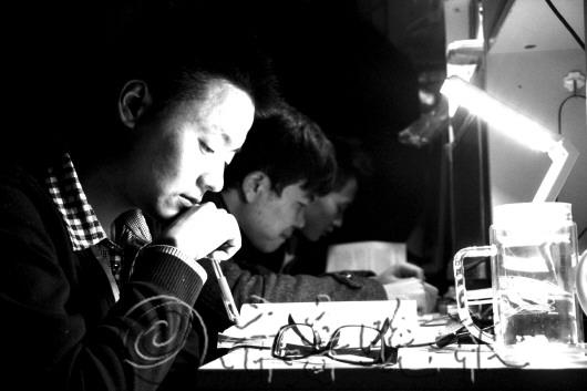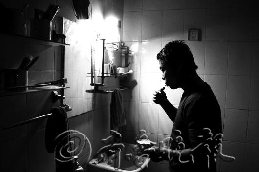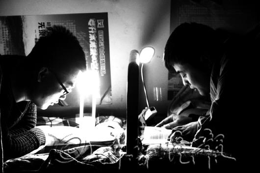 | |  | 张富友和舍友为了考研,每天晚上都学到很晚。 |  | 杨辉(右)和他的对铺喜欢对着头学习,方便讨论,在他们心里只有考研。 |  | 工作人员正忙着接听电话。 |  | 接线员的工作要用到四台电脑。 |  | 刘状总过了24点才开始洗漱睡觉,因为不断电的每一分钟他都用来学习。 |  | 怕冷的李忠浩熄灯后总喜欢在被窝里看书。 |  | 接警之余要整理各项报警资料。 |