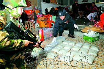 2013年12月29日,广东出动三千警力,“清剿”该省涉毒严重的“第一大村”陆丰市博社村,摧毁18个特大制贩毒犯罪团伙,抓捕嫌疑人182名,缴获冰毒近3吨、制毒原料23吨。近三年,陆丰冰毒占全国份额超三分之一,博社村内两成以上家庭直接或参股从事制贩毒活动。图为警方从一户村民家中搜出大量冰毒。