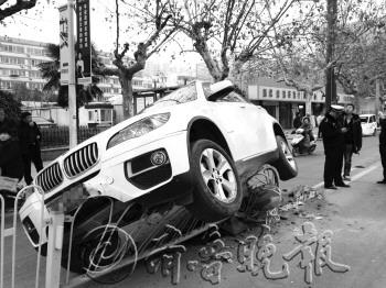 | “砰”的一声,宝马车“骑”上护栏 |