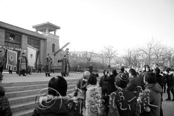 | 梁山景区内,游客观看文艺演出。 |