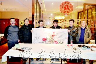 元旦这天,枣庄市书协、美协的书画家汇聚居然之家“爱在友联·为家”书画邀请展,用自己的作品向2013年枣庄市道德模范献礼。图为,众位书画家合作作品“富贵平安图”向道德模范致敬。 于鹏 摄影报道