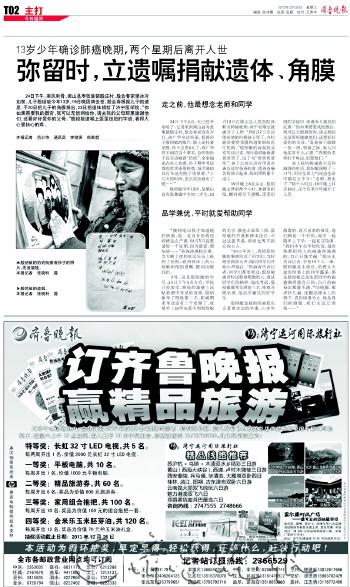 本报济宁1月5日讯 (记者 范少伟) 本报2013年12月26日报道的《少年弥留时,立遗嘱捐献遗体、角膜》 ,其中“大义”少年殷绍敏获得“天天正能量”第29期二等获,奖金将给他的父母。 13岁,本该是围绕在父母膝下撒娇玩耍的年龄,然而无情的病魔却过早的夺去了殷绍敏的生命。在即将离世的一刻,这位花季少年写下遗书,捐献自己的眼角膜和身体。稿件发出后,在社会上引起强烈反响,这位少年的勇气和爱心让人感动至深。 在“天天正能量”第29期评奖过程中,殷绍敏荣获二等奖,奖金将给他的父母。“天天正能量”项目由阿里公益倡议发起,旨在通过发掘、传播和奖励社会上的正能量人物或事件,推崇人性真善美,弘扬社会正能量。项目充分利用互联网及传统媒体资源优势,发动全国网友参与互动,同时邀请了一批全国知名媒体单位及社会各界知名人士,对发生在全国各地的正能量事件,进行推送、传播和评选。每周评选出的获奖正能量故事,将根据所得票数多少,分别获得由“天天正能量”项目组颁发的正能量奖金。