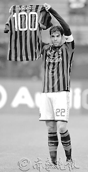 本报讯 1月6日晚,意甲展开第18轮争夺,坐镇主场的AC米兰队以3:0大胜亚特兰大队,在新年取得开门红,同时也是近5场正赛的首胜。 卡卡在本场比赛中迎来了高光时刻。第35分钟,AC米兰队快速反击,埃玛努埃尔松送出直塞球,卡卡快速插上成功反越位,在大禁区左侧6米处面对康西格利冷静右脚推射低平球打远角得手。在新年首战,正是卡卡为球队充当了启瓶器角色,更为重要的是,这是卡卡为米兰打进的第100个进球。进球后的卡卡做出标志性的双手指天动作,同时他高举早已准备好的印着“100”号的球衣向观众致意。 这个进球让卡卡成为米兰第10位进入百球俱乐部的球员。