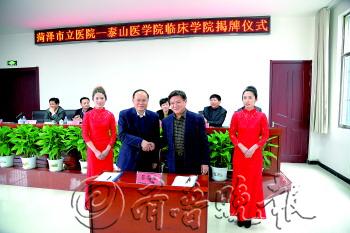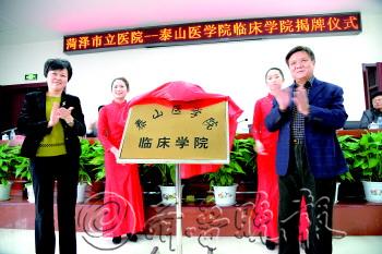 | 菏泽市副市长黄秀玲与泰山医学院副院长王庆宝共同为泰山医学院临床学院成立揭牌。 |  | 泰山医学院副院长王庆宝还与菏泽市立医院院长赵利华签订协议书。 |