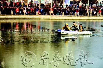 | 9日上午11时许,在明月湖风景区,消防人员正在湖面上打捞落水者。 本报记者 王小会 摄 |