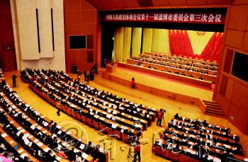 9日上午,市政协十一届三次会议在齐盛国际会议中心大会堂开幕。来自全市社会各界的政协委员齐聚一堂,积极履行政治协商、民主监督、参政议政职能。淄博市政协十一届三次会议应到委员426名,实到410名。 本报记者 姜文洁 摄影报道