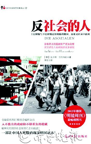 《反社会的人》 [德]伍伦韦伯 著 光明日报出版社 作者从不同角度向读者展示了德国社会结构中日益壮大的两端:财富阶层与庞大失业人群,他们促使金融和社会救助行业得以畸形地快速发展,使德国社会面临着分崩离析的局面。