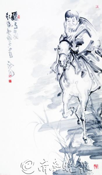 □4月21日—26日,在于潍坊举办的第三届中国画节上,举办了“琢墨——许向群、张力弓、赵初凡、李连志中国画作品展”。 □5月15日—6月10日,“意笔写真”——赵初凡水墨艺术展在北京士东艺术馆举办。 □7月26日—8月9日,在中国美术馆联合举办了“庆祝中国人民解放军建军86周年总参美术作品展”。 □8月1日—4日,在第五届中国书画名家精品博览会上举办了“琢墨——许向群、张力弓、赵初凡、李连志中国画作品展”。 □8月10日,去新疆德汇会所创作。 □9月10日—15日,宜兴市文广新局、宜兴市文联、中国人民解放军总参谋部美术创作院为赵初凡在宜兴市美术馆举办了“军旅画家赵初凡中国画展”。 □9月20日—10月初,先后在湖北神农架和西安地方部队写生。 □10月中旬,在广州举办展览活动,并确定来年展览事宜。 □12月22日-24日,参加解放军总参主办的“纪念毛泽东诞辰120周年全国书画展”。 □12月26—2014年1月6日参加“江山如此多娇——毛泽东诗词书画创作展”。 ▲双骏图 68x136cm 赵初凡 1964年生于山东潍坊,毕业于解放军艺术学院美术系,中国美术家协会会员,解放军总参美术创作院艺术委员。擅长国画人物,工笔写意兼具,花鸟山水、书法篆刻、诗文多有涉猎。绘画始于工笔,后以水墨见长,艺术风格另辟蹊径,特点突出,氤氲华滋,气格古雅且具时代感,形成了自己独立的绘画语言和审美体系。其作品入选第八、九、十届全国美展;第九、十、十一、十二届全军美展并多次获奖;荣获国家文化部美术“金彩奖”、“群星奖”;总政治部“解放军文艺新作品奖”。多幅作品被中国美术馆、中国艺术研究院、军事博物馆等专业机构收藏。 2014年一开年,赵初凡就在老家潍坊做了个展,这是他新的一年良好的开端,也是旧的一年忙碌的延续。的确,2013年对赵初凡来说是忙碌的一年,从南到北,从创作到生活,他都安排的满满当当。赵初凡说:“人这一辈子,能干自己喜欢的事儿,就很开心”,正是有这句话的有力支撑,他才把自己当成了笔下那一只只奔腾的马儿,努力奔走不知疲倦,反倒乐在其中。