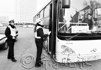 为确保春运安全,济宁市交警支队任城区大队,从1月14日起至春运结束,每天派出2名民警进驻汽车北站,对始发客运车辆进行安全检查。将重点查验车辆制动、灯光、轮胎、座位、安全门、灭火器等是否符合安全标准,车辆和驾驶人的证照是否齐全、有效,坚决杜绝超员问题,并做好检查记录,对不符合安全要求的车辆一律不准驶出站。 本报记者 张林 通讯员 李君皓 摄影报道