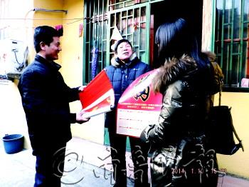 临近年关,邹城市中心店镇为了把党和政府的关怀传递给千家万户,让大家欢欢乐乐过新年,精心印制了带有吉祥“福”字和联户干部送祝福字样的挂历2万余份,组织镇全体联户干部走访入户,一一送到群众手中,在喜庆的节日气氛中进一步加深了干部与群众之间的鱼水深情。 本报通讯员 孙宪超 摄影报道