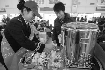 | 16日,在青岛火车站,不少旅客准备返乡。 |  | 在青岛流亭国际机场,旅客们正在登机。 |  | 青岛长途汽车总站的工作人员为旅客准备了热水。 |