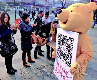 春节临近,商战升级。16日上午,市区步行街一商家让工作人员打扮成卡通熊的形象,并手持店铺用来宣传的二维码,成功吸引了顾客眼球。