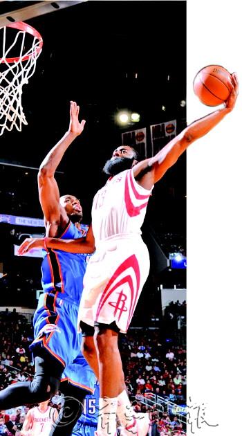 | 火箭不敌雷霆,哈登在比赛中扣篮。 |