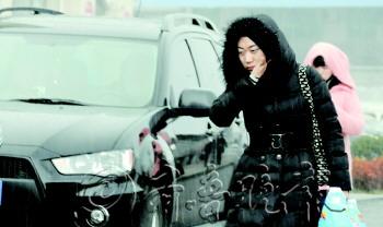 | 17日上午11点左右,空中伴随着降雨飘起白色冰颗粒,路人匆匆赶路。 本报记者 韩逸 摄 |