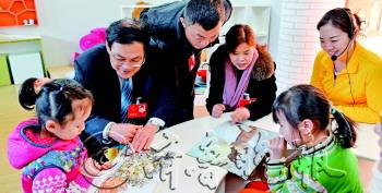 20日,在济南历下区甸柳中心幼儿园,省人大代表王全杰、温永明和王美娇走到孩子们中间,调研历下区部分幼儿园停收保教费的新政。