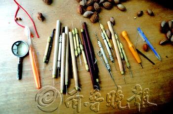 |  | 核雕需要用到很多种小工具。 |  | 在果核上雕刻,要非常细致小心。