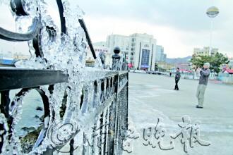 20日,风雪交加,市区最低温度为-4℃。在海港公园岸边,溅起的海浪花在护栏上结成冰块,整个护栏被冰柱封冻,几位市民不顾天冷拍照留念。21日,阴有阵雪转多云,温度-9℃~2℃。请出行市民做好防寒措施。
