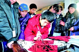 近日,塔山中学学生走进社区,为社区老人们写春联,送新春祝福。图为该校学生专心致志地写“福”字。