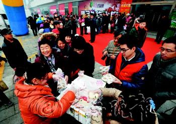 | 年货大集现场,市民排队领取庆丰包子,六天大集将送出千余庆丰包子。 本报记者 张中 摄 |