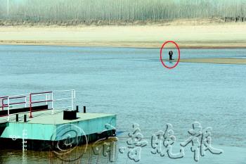 | ◥11点40分,跳河男子被救上岸。 警方供图 |  | ▲站在黄河浅滩上的跳河男子。 |