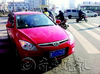 | 一辆红色双号车闯入“禁区”,被交警拦下。 本报记者 钟建军 摄 |