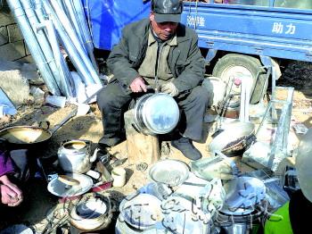 在日照大集,60多岁的补锅匠刘师傅补锅底30多年,是当地为数不多的补锅匠。精敲细打,原本漏的锅就能“康复”了,“经他手中补好的锅,数以万计了。”一位村民打趣道。 刘师傅的补锅摊是一块不起眼的露天空地,摊前摆放着几个已经补好的铝锅。“我们孙三代都是补锅匠,这门祖业已经传承一百多年了。”刘师傅正准备换一个锅底,锅底中间破了一个洞,他先将整个锅底的铝皮全部剪掉,之后将锅的边缘放在专用的铁块上,用锤子将边缘敲平。 接着,他拿出一块圆形的铝皮,先同锅底比一下,剪去多出来的铝皮,再将剪好的铝皮放在铁块上敲出一个边。然后将铝皮直接套住锅,用锤子敲击铝皮,让其贴住锅。最后用清漆与石粉混合物涂在锅与铝皮之间的缝隙,这样一个锅的锅底就换好了。 因为补锅既辛苦又不赚钱,近几年来,想学补锅的学徒一个都没有,让他们感到很失落。“我们补锅一方面为了生计,也因为放不下这门手艺。眼见着老手艺将要失传,总感到失落。”刘师傅说,“做到自己动不了,能将这门手艺维持多久就多久。”