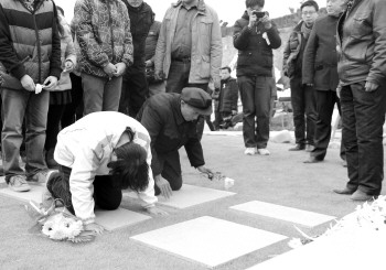 24日,在追思会上,崔山连续资助三年的学生蒋凤美和父亲,从家里赶来,跪在崔山遗像前久久不起。 本报记者 张伟 摄