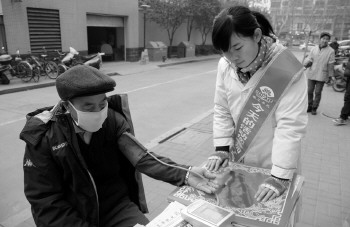 漱玉平民工作人员为老人测血压。 本报记者 姜文洁 摄
