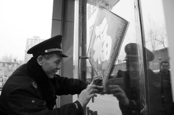 小区保安贴“福”字。本报记者 姜文洁 摄