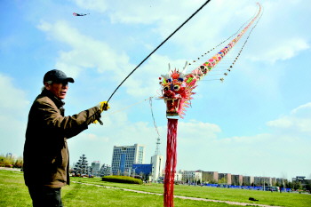 在张店政务中心广场,一老人在放风筝。