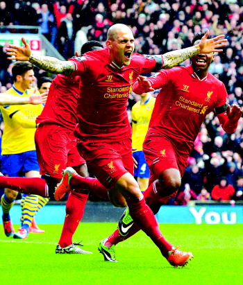 2月8日,利物浦队球员斯科特尔庆祝进球。当日,在2013-2014赛季英格兰足球超级联赛第25轮比赛中,利物浦队主场以5:1战胜阿森纳队。