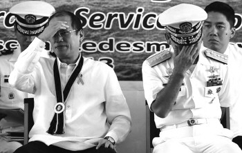 2013年5月21日,菲律宾总统阿基诺三世(左)出席菲海军建军115周年仪式,誓要提升海军战力。