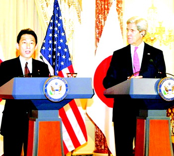 克里当天与岸田文雄共见记者时,重申在1960年签署的《日美安保条约》里美方对其盟友日本作出的承诺。克里说,美国将继续致力于在条约底下对日本的义务。克里说,这一承诺“包括东中国海”。
