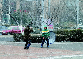 9日,省城市民在雪中自拍。 本报记者 左庆 摄