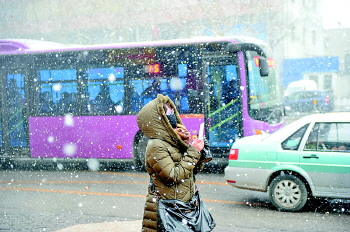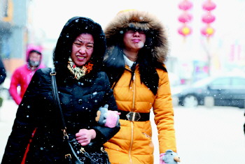 9日,烟台下起小雪,行人走路时不得不眯着眼睛。