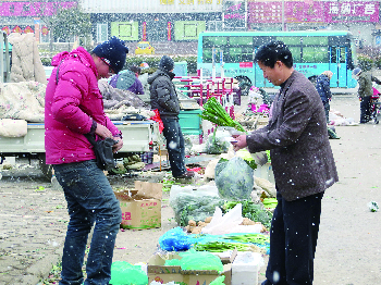 9日,记者来到北京路市场,大雪纷纷扬扬,出摊的商贩并不是很多。一些已经出摊的菜商,不得不拿厚厚的棉被将蔬菜盖好,有市民来买的时候再将棉被掀开。