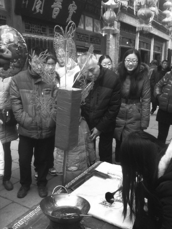 1月31日,农历大年初一,周村大街上充满了游客的笑声、商贩的吆喝声。浓浓的年味儿在张贴的对联里、高挂的灯笼上弥漫开来,而古韵犹存的糖画透着甜甜的年味。