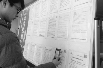 11日上午,在海尔路人才市场,前来找工作的应聘者挤满了大厅。各个公司的招聘展位前更是被围得水泄不通,有的展位前还排起长龙。今年将要毕业的山东师范大学学生王亚男在人才市场里转了将近一个小时,也没能挤到招聘展位前看一下招聘信息。这让王亚男急得直跺脚。不过,当她回到一楼的招聘展板前时,发现很多求职者拿着手机对着展板拍,她好奇地凑上前去一看,才发现展板上张贴着的招聘信息上都印有二维码。“大家别挤,用手机拍下这个二维码,回去可以慢慢查看招工信息再投简历。”站在展板前的一名招工者边维持秩序,边向求职者介绍着二维码。王亚男赶紧拿出手机扫描二维码。“这样就不用挤来挤去了,而且也能详细了解各个公司的招聘信息。”王亚男说。