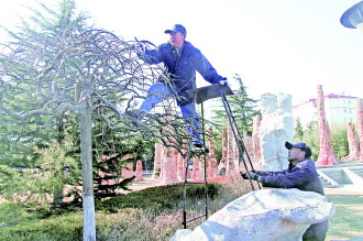 2月11日,天气转暖,园林部门工作人员在皇冠小区为龙爪槐修剪树枝,迎接春天的到来。工作人员说,剪去干枯树枝,不仅能让树木长势更好,也能在刮风下雨时,防止干树枝掉落,砸伤路人。