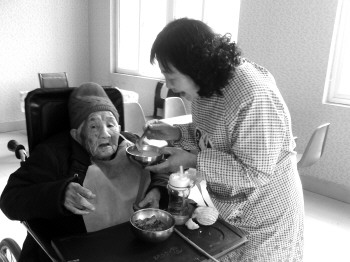 护工赵颖正在照顾一位95岁的老人吃饭。本报记者 范少伟 摄