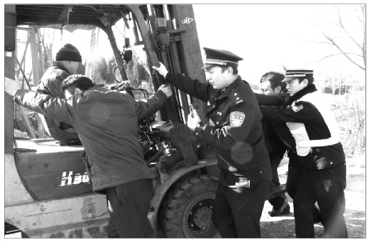 列车将至叉车抛锚道口,民警帮助及时排除险情。 通讯员 张涛 摄