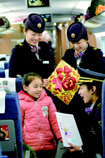大年三十,济南客运段高速动车队第三包乘组乘务员向乘客送“福”拜年,一名小乘客将自己的绘画作品赠给乘务人员并说:“姐姐,辛苦了”!