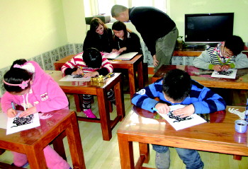 高老师先拿出了他的刻纸作品让我们欣赏,在榕叶上刻得栩栩如生的十二生肖、2008年的奥运福娃系列让我们拍手称赞。据法国留学生讲,法国也有刻纸,但不如中国的精美。既然这么精美,我们能不能试一试呢?高老师分别给我们纸样、红纸、刻刀、刻板,我们按照老师的指导,一板一眼地刻了出来。原来,想刻出一幅完整的作品可不简单,由里到外、由小到大,必须要顺着花纹的走势来刻,手一抖就会变形或刻断,还真得静下心来慢慢来。