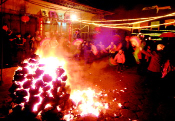 在老家,除夕夜12点的时候,象征辞旧迎新的烟花爆竹会五彩斑斓地照亮夜空。除了烟花爆竹之外,最有特色的当数旺火,是用形状相对规则的煤块垒成底小、肚大、顶尖、内空的宝瓶形状。马路上,每走一段就能看到临街单位垒起来的旺火,规模大的有两米多高。凌晨放完鞭炮后,人们会绕着旺火顺时针、逆时针各转三圈,祈求新年万事如意、平安吉祥、心想事成。