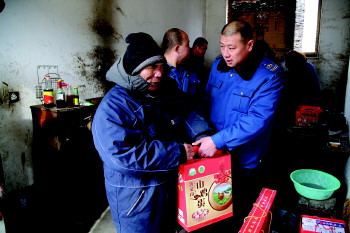 13日,青岛公交集团城阳分公司111路市级敬老文明号线路的“爱心陪伴”志愿者们,为城阳区宫家村的空巢盲人宫老汉送去元宵、牛奶、鸡蛋等礼物,陪老人一起过元宵节。