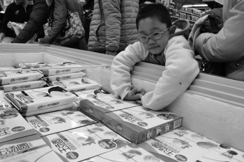 在张店华光路一家超市,一位小朋友在挑选水果味汤圆。