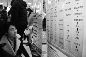 “现在年轻人找工作更加看重个人发展、企业实力、规模和晋升通道,所以这次我们特地做了这个展板,展示求职者应聘这份工作后,他们的发展通道是怎样的。”聚成股份有限公司营销主管姜剑桥介绍说。此外,不少企业还直接在宣传单页上印上了集团晋升通道图和晋升标准。